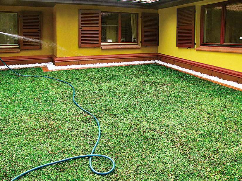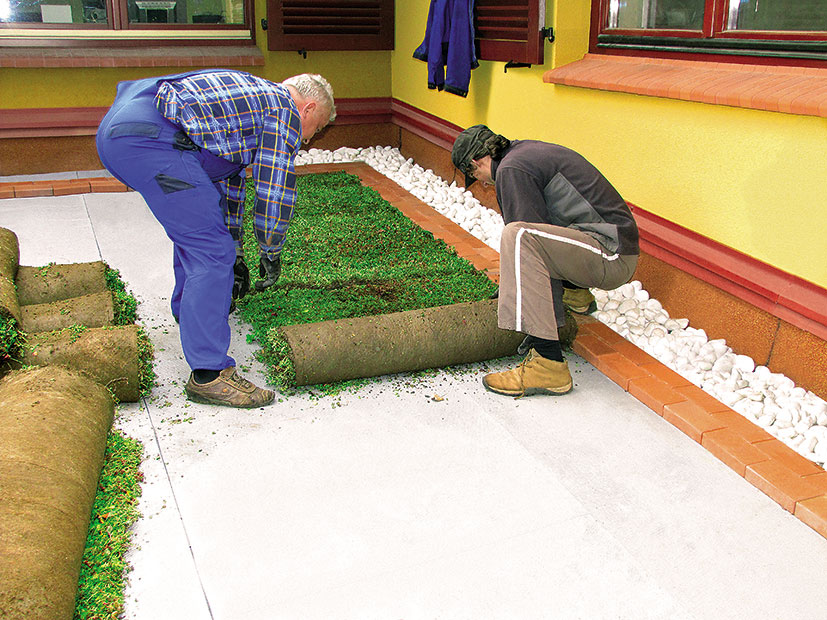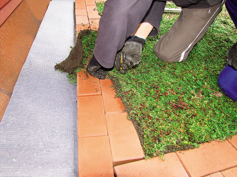 Navyše zabezpečuje trojnásobne dlhší čas vysychania ako substrát. Keďže má vysoký obsah prírodných zložiek, ideálne sa znáša so zelenou časťou a poskytuje vhodné podmienky na zakorenenie rastlinstva. Jednotlivé vrstvy sa ukladajú na kríž, vždy nasledujúca vrstva kolmo na už položenú vrstvu geotextílie. Jednotlivé časti retenčnej vrstvy sa kladú buď voľne, alebo sa medzi sebou môžu lepiť asfaltovým či polyuretánovým lepidlom. Priamo na retenčnú vrstvu sa aplikujú vegetačné rohože určené na ploché strechy. Sú tvorené machmi, kvitnúcimi bylinami a rôznofarebnými rozchodníkmi. Pásy vegetačnej zelene s rozmermi 1 × 1 m alebo 1 × 2 m sa kladú priamo na plochu strechy a navzájom sa zviažu. Zelenú časť v systéme tvorí predpestovaná vegetačná rohož, ktorá je v okamihu dodania na miesto určenia na 70 až 100 % pokrytá zeleňou. Nie je potrebné čakať päť až šesť mesiacov, aby rastliny vyrástli. Na úpravu vegetačných rohoží pri okrajoch strechy sa používa ostrý nôž. Odrezané kúsky vegetácie sa môžu použiť pri realizácii ďalšej časti strešnej krytiny, aby sa neplytvalo materiálom. Po uložení vegetačných rohoží je potrebné hotovú zelenú strechu dokonale zaliať tak, aby súvrstvie nasalo maximálne množstvo vody. Následne si extenzívna zelená strecha vo fáze rastu nevyžaduje väčšinou žiadne podlievanie, avšak v obdobiach dlhodobého sucha sa odporúča jednorazovo poliať celú plochu strechy vodou. Kladenie takejto zelenej strechy by mala robiť vyškolená realizačná firma. Pri realizácii sa postupuje tak, ako vidieť na obrázkoch.