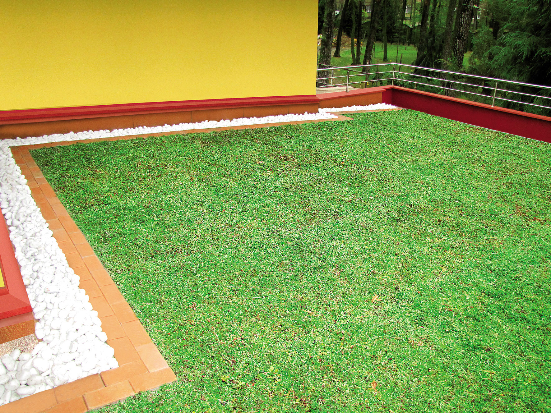 Sklon strešnej plochy by mal byť od 2° do 6°. Strecha musí byť vyspádovaná smerom k odvodňovacím bodom. Na nosný betónový podklad plochej strechy ošetrený penetračným náterom sa aplikuje asfaltová parozábrana. Nasleduje vrstva tepelnej izolácie a potom hlavná hydroizolačná vrstva z dvoch asfaltovaných pásov. Ako podkladový pás možno použiť modifikované asfaltované pásy, na ktoré sa natavia pásy s funkciou ochrany proti prerastaniu koreňov rastlín. Veľkú pozornosť treba venovať dokonalému nataveniu pásov predovšetkým na miestach ich vzájomných presahov, aby sa zabránilo prieniku vody do strešného plášťa. Na hotovú hydroizolačnú vrstvu sa aplikuje drenážna rohož. Drenážna rohož svojím zložením zaisťuje vysoký súčiniteľ filtrácie vody celým svojím povrchom a chráni drenážny systém pred zanesením. Obojstranne použitá netkaná geotextília so splietanou štruktúrou polyamidových vlákien navyše rovnomerne rozkladá tlak vrstiev zelenej strechy na hydroizoláciu. Je pružná, pričom sa ľahko ukladá aj prispôsobuje nerovnostiam podkladu. Na podklad sa len voľne položí alebo sa môže lepiť asfaltovým či polyuretánovým lepidlom. Pozdĺž odkvapu a na ďalšie nevyhnutné miesta sa upevnia podperné a odkvapové lišty z nehrdzavejúcej ocele. Lišty majú perforáciu, ktorá umožňuje odtok nadbytočnej zrážkovej vody z retenčnej vrstvy. Najskôr sa na podklad prilepia polyuretánovým lepidlom a následne sa fixujú prostredníctvom natavenia pruhov špeciálnych asfaltovaných pásov určených na strechu. Na drenážnu rohož sa aplikuje retenčná vrstva. Skladá sa zo sústavy siedmich vrstiev špeciálnej geotextílie (sklon do 6°), resp. z desiatich vrstiev (sklon od 6 do 35°). Ide o systém skladajúci sa z vrstiev netkanej geotextílie, ktorá zabezpečuje zároveň retenčnú aj drenážnu funkciu a vnútornú cirkuláciu vzduchu.