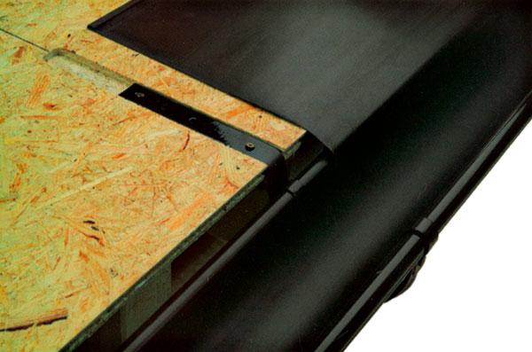 | Držiak žľabu treba zadlabať do debnenia a odkvapový plech vyviesť do žľabu. | Na odkvapový plech sa položí pás fólie s integrovanou lepiacou páskou, ktorý sa prilepí lepiacou hmotou. | |