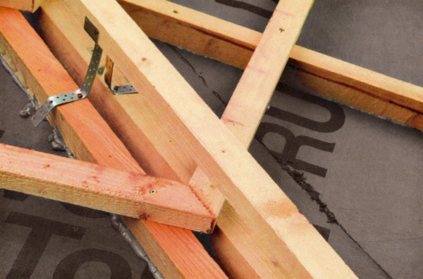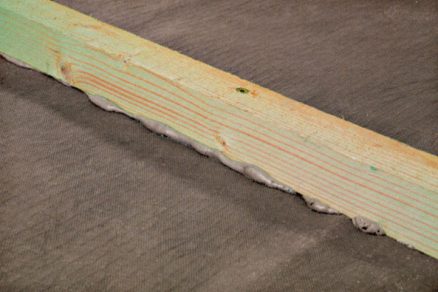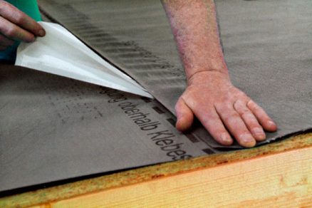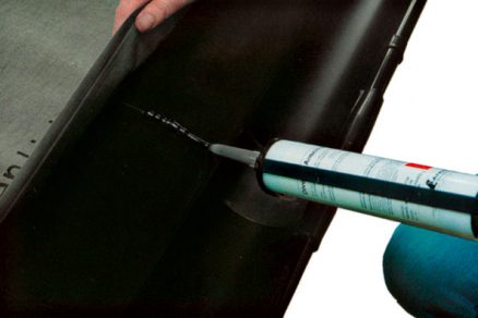 | V zvislom smere sa spoj lepí lepiacou hmotou, ktorá sa nanáša 1 až 2 cm od okraja fólie. Samotné preloženie musí byť min. 12 cm široké. | Kontralatu uloženú na fólii treba utesniť pomocou tmelu. Ten sa nanáša po celej dĺžke kontralaty v hrúbke asi 0,5 cm pásika. Po preklopení kontralaty na požadované miesto dochádza k vypeneniu a vytesneniu tmelu. | |