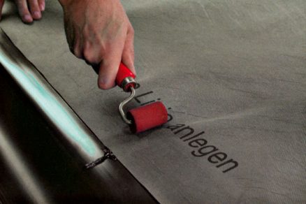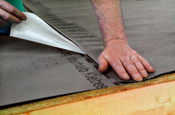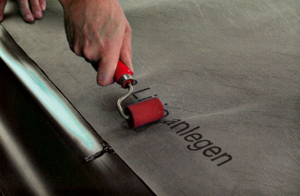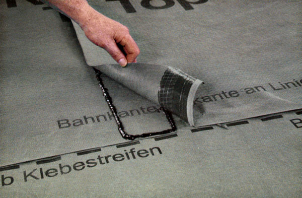 | Následne sa tento pás prilepí aj lepiacou páskou. | Dve fólie v ploche treba spojiť pomocou integrovaných lepiacich pásov na fóliách. | |