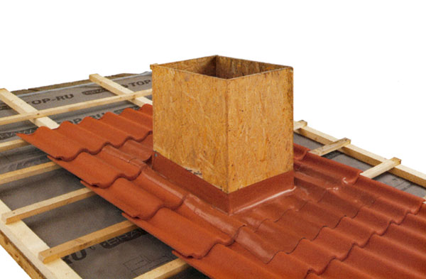| Každé komínové napojenie cez fóliu sa odporúča riešiť pomocou univerzálneho ukončovacieho prvku strešnej krytiny. | Prestup komína pomocou ukončovacieho prvku treba riešiť tak, že sa 10 cm vyvedie na fóliu a zvyšných 18 cm na komín. |