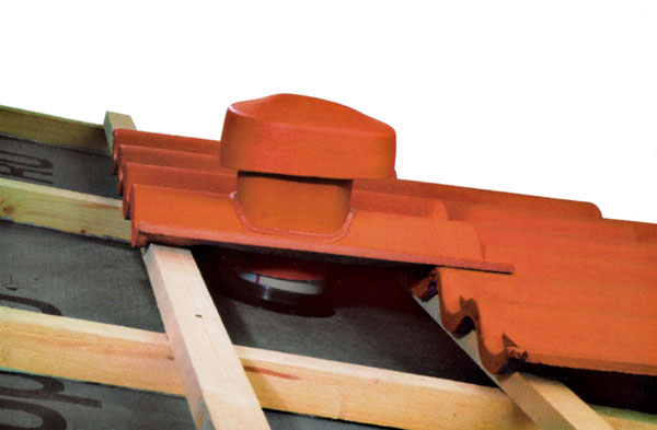 | Nárožie sa vytvorí pomocou dvoch pozdĺžnych kontralát, ktoré sa utesnia tmelom. Na ne sa prichytí univerzálny držiak hrebeňovej laty, ktorý slúži na uchytenie nárožnej laty. | Odvetrávacia škridla sa napojí na kanalizáciu a digestor pomocou prestupovej sady. | |