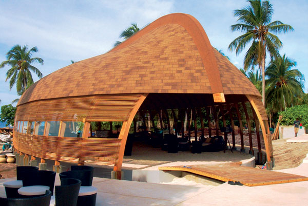 | Obr. 1 Šindľová strecha na dreveniciach v Demänovskej doline | Obr. 2 Šindle použité na stavbe na Maldivoch | Obr. 3 Rodinný dom v Českej republike |