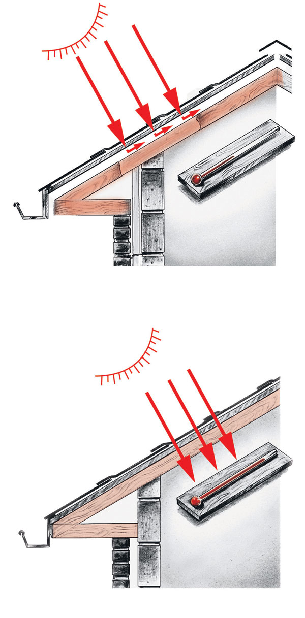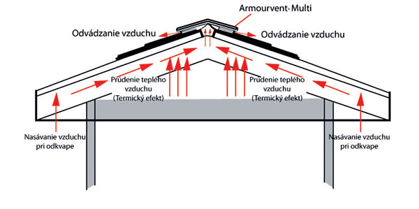 Kľúčom k správnemu odvetraniu strechy je vyvážený ventilačný systém. Umožňuje únik tepla a vodných pár zo strešného plášťa. Vzduch musí mať možnosť voľne cirkulovať medzi izoláciou a strešným debnením, a to v celej dĺžke od odkvapu až po hrebeň strechy (obr. 5). Znamená to, že každý štvorcový centimeter odvádzaného vzduchu musí byť vyvážený rovnakým množstvom nasávaného vzduchu pri odkvape. Vzduch prirodzeným prúdením vďaka termickému efektu (komínový efekt) a difúzii vytláča teplo a vlhkosť. Pokiaľ dôjde k narušeniu rovnováhy v tomto systéme a čistá voľná plocha odvetrania NFA (Net Free Area) pri hrebeni je väčšia než pri odkvape, môže vzniknúť opačné prúdenie vzduchu, ktoré bude mať opačný negatívny efekt. Teplo a vlhkosť sa nebude uvoľňovať, ale naopak zvyšovať a hromadiť pri dolnej časti konštrukcie strechy.