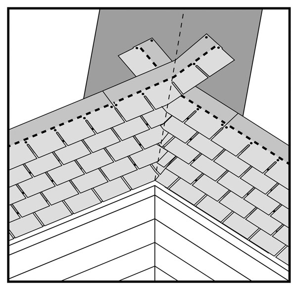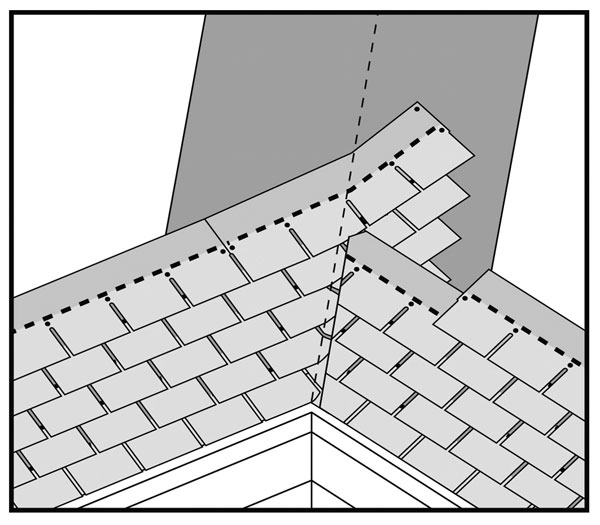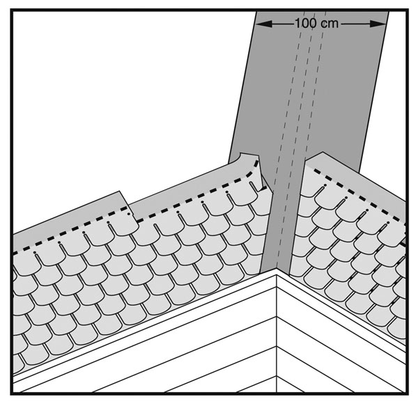 Úžľabie možno aplikovať na pôvodnú vrstvu šindľov použitím plastometrického pásu s keramickými granulami v rovnakých farebných odtieňoch ako šindle alebo možno použiť plechové úžľabie. Úžľabie možno klásť ako otvorené, prepletané úžľabie alebo jednostranne zarezané úžľabie (obr. 9a, b, c).