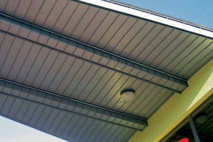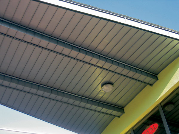 Azda najpôsobivejšou časťou objektu BATO je opláštenie podhľadu v časti pasáže. K tejto konštrukcii bolo treba pristupovať obzvlášť obozretne už v štádiu návrhu hrúbky plechu, osovej vzdialenosti kotviacich prvkov a uhlových stojatých drážok. Požiadavka architekta bola stanovená úplne presne – drážky vyúsťujúce zo strešnej krytiny musia nadväzovať na drážky na štíte a následne v určitých násobkoch na drážky na podhľadoch. Funkčné a vizuálne nároky sa dali splniť len na základe správnej voľby hrúbky a osovej vzdialenosti. Práce na podhľadoch a zastrešení sa realizovali na vysokej kvalitatívnej úrovni a v plnej miere sa prejavil cit pre remeslo a profesionalita realizačnej firmy. Realizácia kovových konštrukcií splnila očakávania riešiteľa projektu aj investora po funkčnej i estetickej stránke a bola vhodným doplnením ostatných použitých stavebných materiálov.