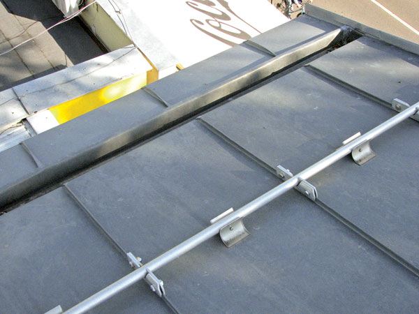 Počas návrhu zaatikového žľabu na odvodnenie strechy s konvexným tvarom nebolo možné vyhotoviť pôvodne zamýšľané odvodnenie tak, aby slúžilo spoľahlivo a bezpečne počas celej životnosti titánzinkového materiálu. Hlavnou príčinou bol nedostatok priestoru na hĺbku žľabu a na nevyhnutné vyspádovanie k strešným odtokom. Preto technický poradca firmy dodávajúcej krytinu odporučil iný spôsob zastrešenia tejto strešnej plochy – zvolila sa povlaková krytina na báze PVC fólií. Architekt však chcel zachovať kovový ráz viditeľných častí zastrešenia z pohľadu chodca. Takto vznikla na objekte pochôdzna strecha, pre ktorú bolo treba počas výstavby doprojektovať bezpečný výstup na strechu. Zároveň vzniklo v konštrukcii niekoľko zriedkavo používaných, korektne navrhnutých a vyhotovených detailov napojenia titánzinkovej krytiny na povlakovú krytinu z PVC.