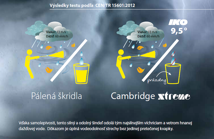 Jednou z najväčších výhod šindľovej strechy je vysoká odolnosť voči vetru. Samolepiace šindle IKO boli testované vo veternom tuneli, kde bez problémov vydržali odolať vetru o rýchlosti cez 220 km / h. Aj vďaka svojej extrémnej odolnosti voči všetkým extrémom počasia získal šindeľ Cambridge Xtreme 9,5 ° svoje meno. Ochráni strechu pred snehom, ľadom, a keď bude silná búrka s krúpami, vy si to ani nevšimnete, pretože šindeľ je pružný a nárazy ľadovca nebudete vôbec počuť.