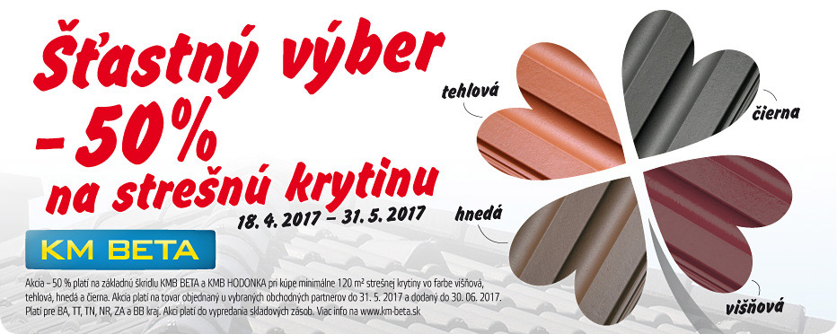 V aktuálnej akcii na strešnú krytinu KMB BETA a KMB HODONKA môžete nakúpiť základnú škridlu zo zľavou 50%. Viac informácií nájdete na www.km-beta.sk.