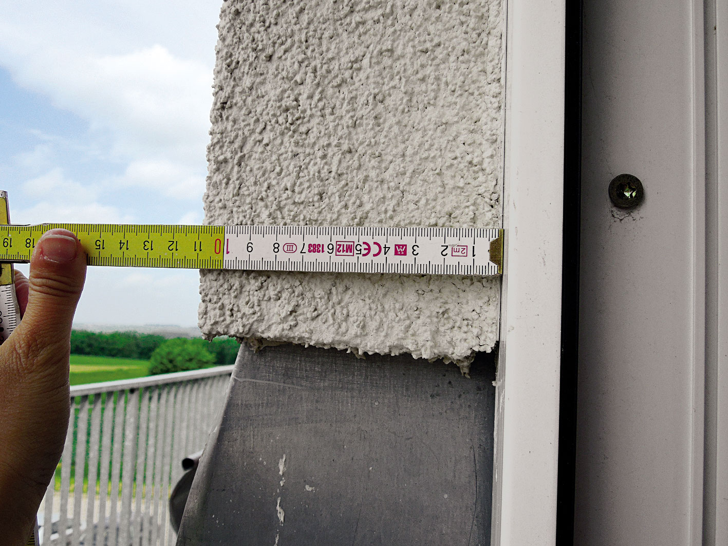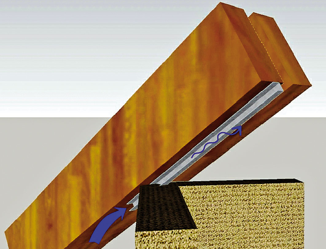• nedokonale vyhotovená difúzna fólia proti prenikaniu vzduchu (vetrová prekáž­ka) v oblasti zložených drevených stĺpikov, čím vzniká citeľné prúdenie chladného vzduchu do tepelnej izolácie na báze minerálnych vlákien cez vzniknuté škáry medzi drevenými prvkami (obr. 6 a 7). Táto difúzna fólia je ukončená na zloženom stĺpiku;