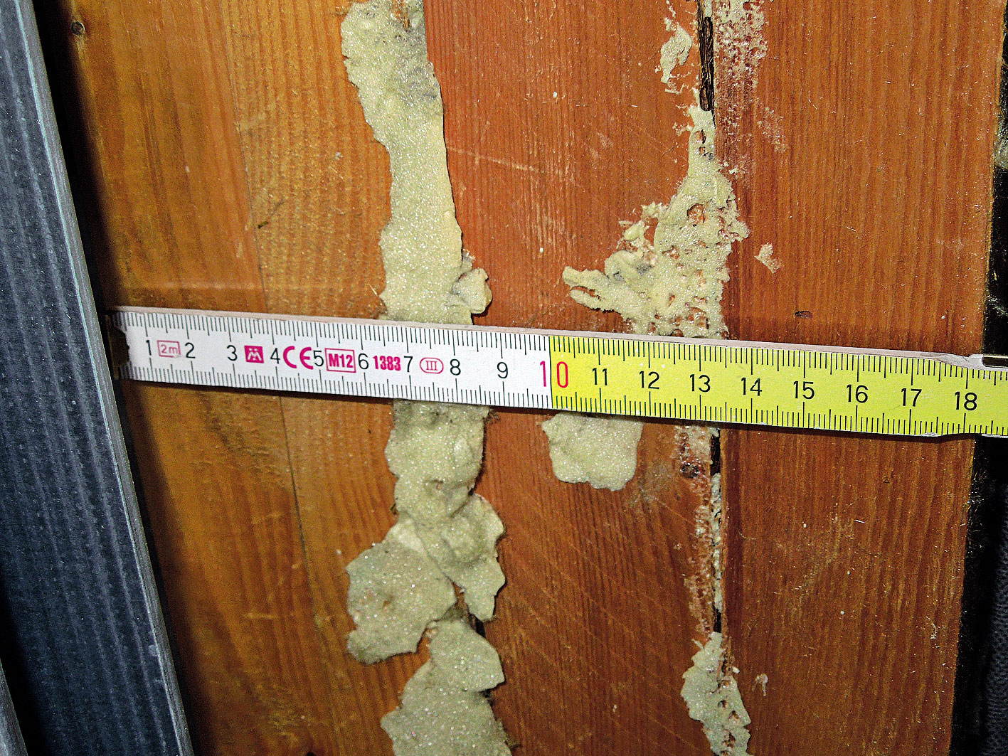 Obr. 6  Škáry medzi drevenými prvkami aj po niekoľkých opravách spôsobujú prúdenie chladného vzduchu do tepelnej izolácie na báze minerálnych vlákien.