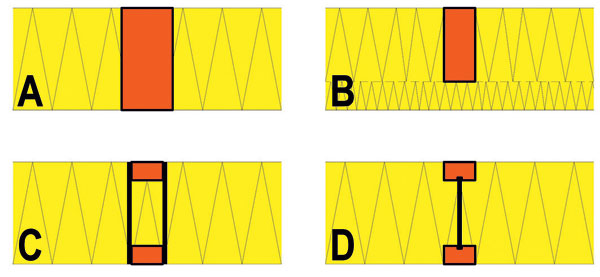 Obr. 1 Príklady konštrukčného riešenia krokiev (A – nevhodné, B, C, D – vhodné riešenie)