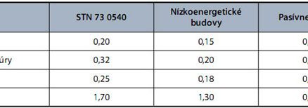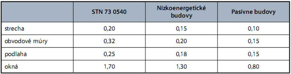 Staré budovy z minulosti majú obvykle potrebu tepla na vykurovanie dvoj- a viacnásobne vyššiu ako štandardné novostavby. Štandardná novostavba je v podstate budova, ktorá je realizovaná podľa aktuálnych záväzných normatívnych požiadaviek a jej potreba tepla na vykurovanie je v rozmedzí 80 až 140 kWh/(m2 . rok) v závislosti od faktoru tvaru. Potreba tepla na vykurovanie je pre nízkoenergetický dom menšia nanajvýš rovná 50 kWh/(m2 . rok), pre pasívny dom menšia nanajvýš rovná 15 kWh/(m2 . rok) a pre nulový dom menšia ako 5 kWh/(m2 . rok). Vývoj energetických požiadaviek na budovy sa premieta aj do vývoja požiadaviek na samotné stavebné konštrukcie (tab. 1).