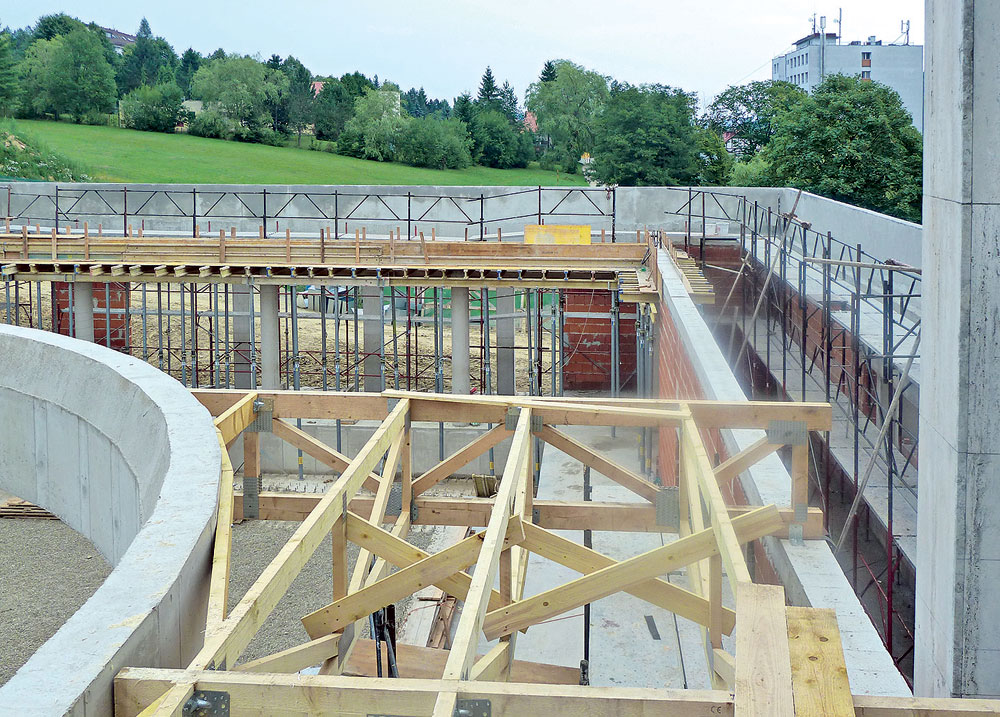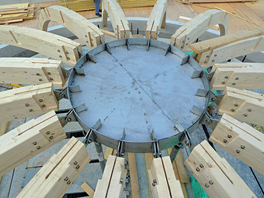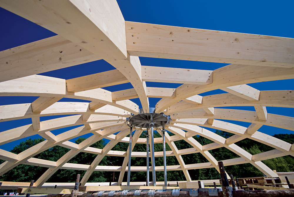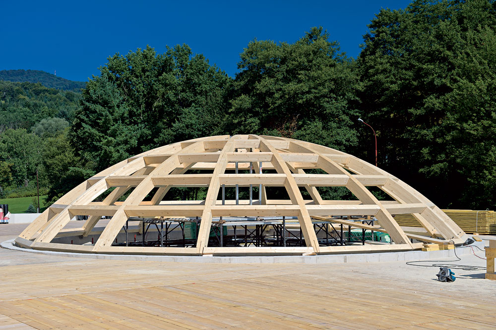 Kupola je navrhnutá ako trojkĺbový rám na báze nosníkov LLD. Jednotlivé nosníky sú kotvené do kruhovej železobetónovej konštrukcie. Na hornej úrovni sú nosníky oblúkových rámov kotvené do kruhového prvku z nehrdzavejúcej ocele. Stuženie je zabezpečené väznicami, ktoré sú uložené kolmo na smer spádnice tak, že horná hrana oblúkových rámov a horná hrana väzníc sú na jednej úrovni. Celá kupola je uzavretá celoplošným dreveným záklopom, ktorý tvorí ďalšiu zavetrovaciu vrstvu. „Bolo pomerne náročné vytvoriť tvarovo zložitú konštrukciu kupoly a strešný plášť tak, aby bol funkčný a bezpečný,“ opisuje náročnosť projektu Ing. Ivan Kolárik, konateľ realizačnej spoločnosti Kontrakting Krov Hrou.