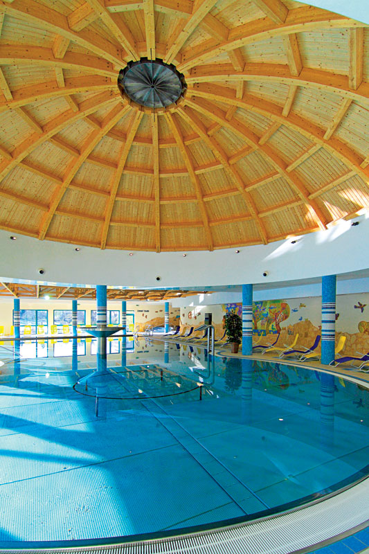 Objektu dominuje plochá strecha, ale nad jednou z častí bazénového priestoru architekt vytvoril drevenú kupolu. „Tvorba vnútorného priestoru vychádza z celkovej filozofie tohto špecifického objektu. Vďaka kupole je daný priestor zaujímavejší a má podstatne väčší objem. Keďže bazénová hala nemohla byť vyššia vo vzťahu k existujúcemu objektu, rozhodli sme sa do priestoru vniesť viac vzduchu aspoň takouto cestou,“ vysvetľuje Ing. arch. Pavol Mikoláš, autor projektu.