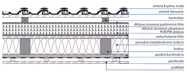 Skladba konštrukcie strechy, kde sa pôvodná medzikrokvová izolácia doplnila celoplošnou nadkrokvovou izoláciou PUR/PIR.