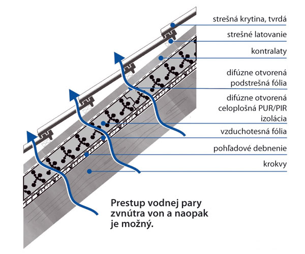 | Skladba šikmej strechy s PUR/PIR izoláciou na krokvách a debnení |