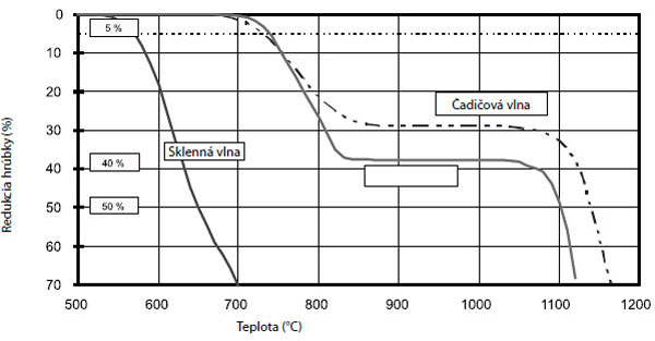 Obr. 3 Závislosť redukcie hrúbky od teploty pre sklenú vlnu (Glass wool), čadičovú vlnu (Stone wool) a novú generáciu minerálnej vlny