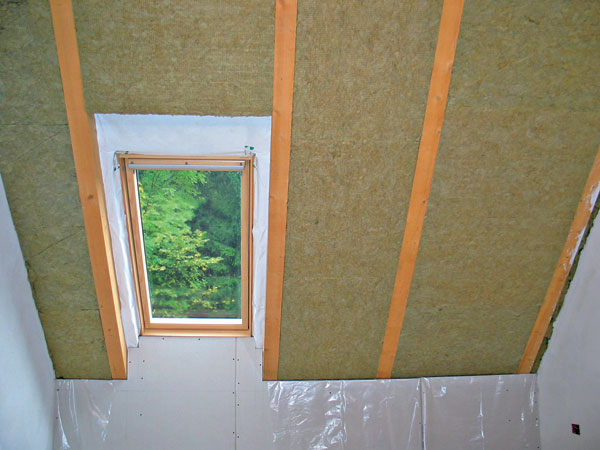 Podkladovú vrstvu pod tepelnou izoláciou tvorí drevené doskové debnenie, prípadne veľkoplošné OSB dosky na krokvách. Následne sa osadzuje parozábrana súbežne s osadením pomocných nosných drevených hranolov. Výška hranolov je závislá od hrúbky izolácie. Do prídavnej konštrukcie sa vkladá tepelná izolácia a na ňu sa pod následné kontralatovanie položí vysokodifúzna fólia. Fólia zabraňuje zatečeniu prípadnej zrážkovej vody do tepelnej izolácie a umožňuje prestup kondenzovanej vlhkosti z tepelnej izolácie do prevetrávanej medzery, ktorá sa realizuje pod krytinou. Prestupy strechou (komín, strešné okno, ventilačné potrubia a pod.) musia byť utesnené veľmi kvalitne. Na úrovni parozábrany a difúznej vrstvy musia byť prestupy prelepené lepiacou páskou dostatočnej šírky. Strešné okno sa osadzuje na drevený rám, na plnú výšku izolácie. Poistná hydroizolačná vrstva – vysokodifúzna fólia musí byť riadne vyvedená na rám okna tak, aby nedochádzalo k zatekaniu.