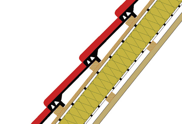 Pri ďalšom spôsobe zateplenia sa medzi krovy vkladá tepelná, akustická a protipožiarna izolácia, ktorá nebude mechanicky zaťažovaná, a nad krokvy sa používa tepelná izolácia s vyššou pevnosťou (obr. 6). Izolácia nad krokvami musí prenášať aj zaťaženie strešnou krytinou a snehom, lebo sa nevkladá do pomocného roštu, ale kotví sa priamo na krokvy.