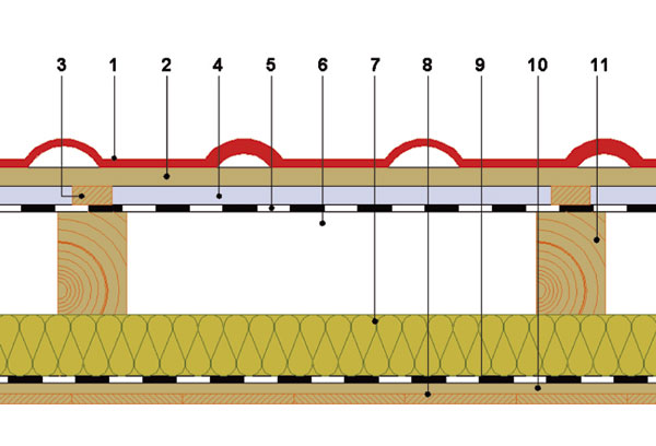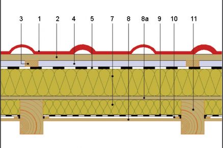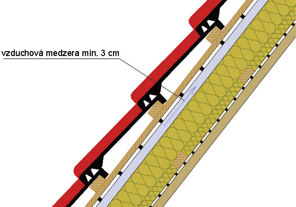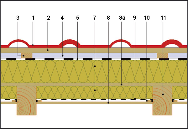 | 1. Strešná krytina, 2. Vodorovné latovanie, 3. Kontralaty (latovanie v spáde strechy), 4. Vonkajšia odvetraná vzduchová medzera, 5. Difúzno – priepustná fólia, 5a. Extrémne difúzno – priepustná fólia, 6. Vnútorná odvetraná vzduchová medzera, 7. Tepelná izolácia , 8. Vnútorný obklad, 8a. Vnútorný záklop, 9. Parozábrana, 10. Nosný rošt vnútorného obkladu, 11. Krokva | |