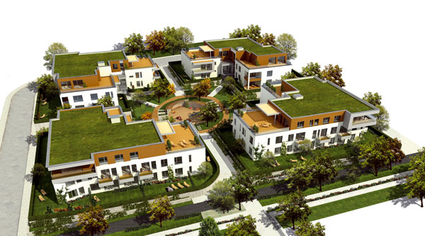 Sú zaužívaným riešením napríklad v prízemných častiach projektov, na strechách podzemných garáží, kde sa zvyčajne využívajú intenzívne ozelenené strechy. Tvoria spoločný priestor obytných domov alebo ich obyvatelia bytov môžu využívať ako záhrady. Vytvárajú pritom príjemné životné prostredie.