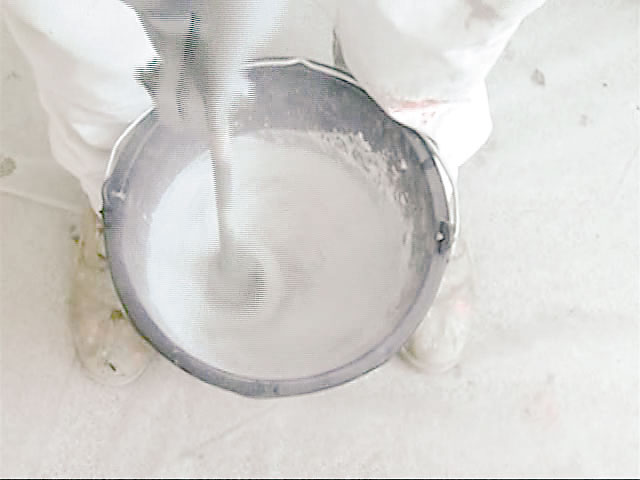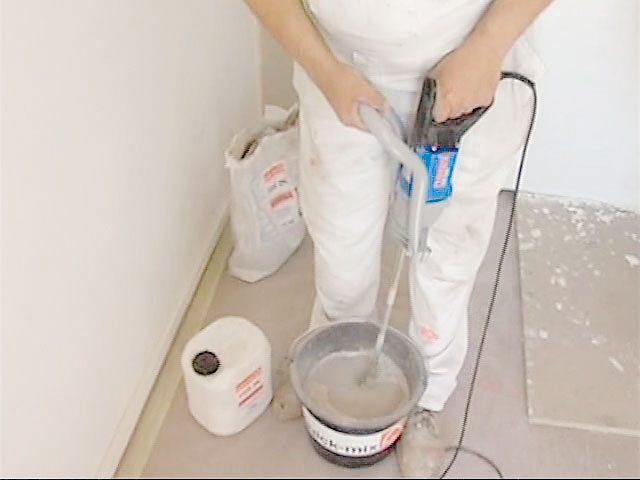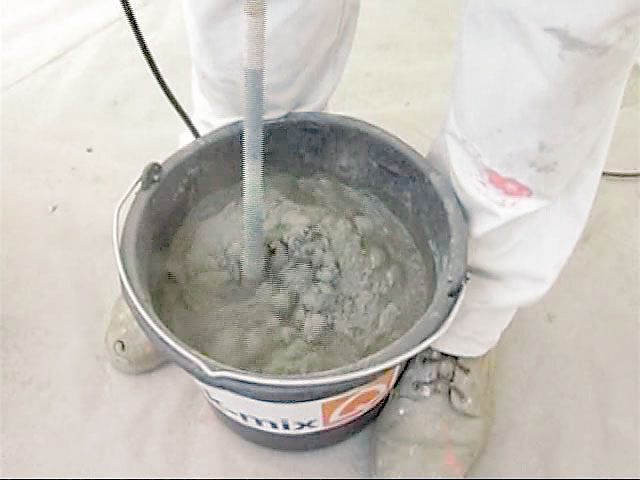 Obsah 15 kg vreca (práškovej zložky) sa dôkladne rozmieša nízkootáčkovým miešadlom (max. 500 ot./min.) s tekutou zložkou v 5-litrovom kanistri na homogénnu zmes bez hrudiek. Vždy sa dáva prášková zložka do tekutej. Zmes sa nechá päť minút odstáť a ešte raz sa premieša.