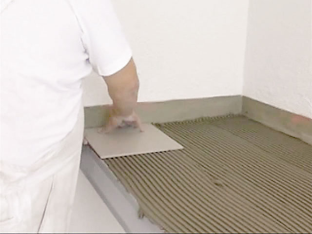 Na lepenie dlažby sa používa flexibilné lepidlo. Potrebné množstvo lepidla sa premieša s predpísaným množstvom vody (približne 6 l) a nechá sa niekoľko minút odstáť. Pri aplikácii lepidla sa používa výhradne náradie z nehrdzavejúcej ocele a zubová stierka s veľkosťou zuba 8 × 8 mm. Pripravená zmes je spracovateľná asi dve hodiny. Do naneseného lôžka z flexibilného lepidla možno ukladať dlažbu. Začína sa od vonkajšieho okraja a pokračuje sa smerom k stene, kde sa obklad zreže na požadovaný rozmer. Následne sa obloží soklík. Na presné vymedzenie spojovacích škár medzi dlaždicami na podlahe a soklíku sa použijú plastové krížiky. Nasleduje 48-hodinová technologická prestávka na zatuhnutie flexibilného lepidla.Na škárovanie sa používa pružný škárovací materiál a sanitárny silikón.