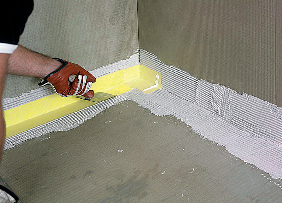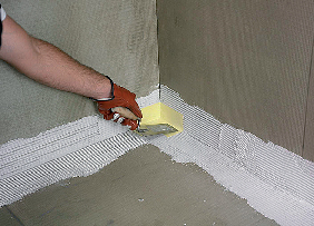 | Naneste lepiacu maltu CM 16, CM 17, CM 22 alebo CM 25 na podklad zubovou stierkou (veľkosť zubov 4 mm). Do ešte čerstvej lepiacej malty vložte rohové prvky, tesniace pásy a manžety a dotlačte hladkou stranou hladidla. | Presahy medzi jednotlivými prvkami a pásmi musia byť min. 5 cm. Spoje zlepte a utesnite pomocou lepiaceho tmelu Ceresit FT 101. |