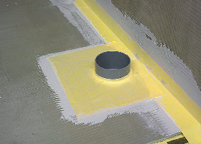 | Tmelom utesnite tiež obvod priestupov a inštalačných priechodiek. | Následne položte na podklad utesňovaciu a separačnú podložku Ceresit CL 69 Ultra-Dicht a narežte alebo nastrihajte ju na požadované rozmery. |