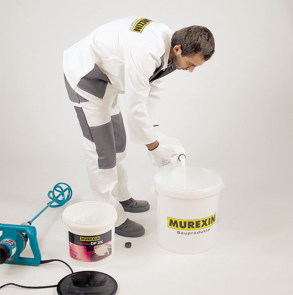 Po vyschnutí penetračného náteru možno naniesť tekutú hydroizolačnú membránu. Obidve jej zložky sa zmiešajú v predpísanom váhovom pomere (prášok : kvapalina = 2 : 1). Môže sa použiť celé, presne nadávkované balenie. Zložky sa miešajú v čistej nádobe nízkootáčkovým elektrickým miešadlom, kým nevznikne homogénna zmes bez hrudiek. Čas miešania je približne 3 minúty. Namiešaná zmes sa na podklad nanáša zubovým hladidlom v rovnomernej vrstve. Povrch sa ľahko uhladí opačnou stranou hladidla. Hydroizolačná stierka sa nanáša v dvoch pracovných krokoch s odstupom približne 2 hodiny. Celková vrstva musí byť celistvá a nemala by byť tenšia ako 2 mm.