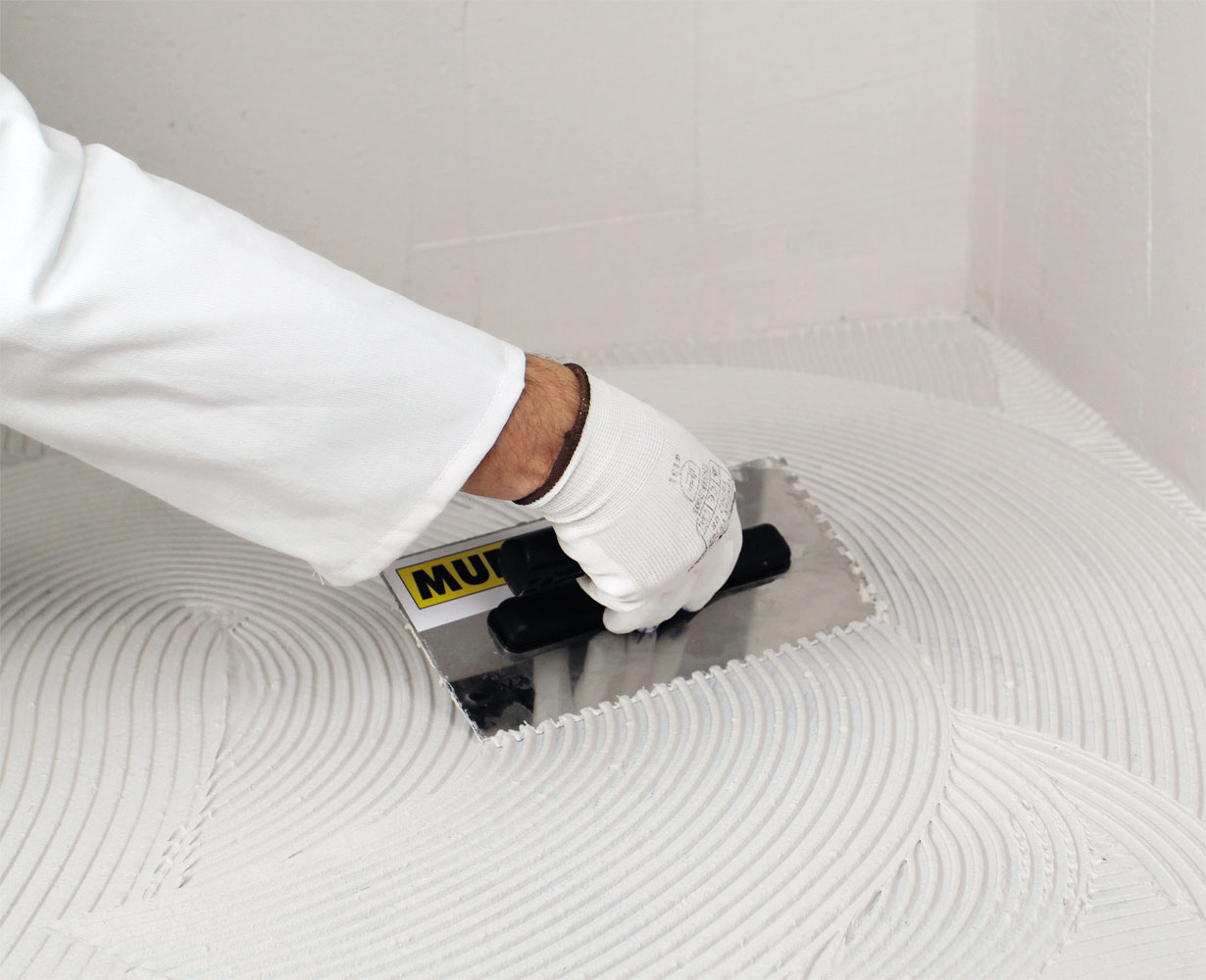 - Náradie:čistá nádoba, nízkootáčkové elektrické miešadlo, zubová stierka (veľkosť zuba 8 mm), maliarsky štetec alebo penový valček, gumená stierka, špachtľa