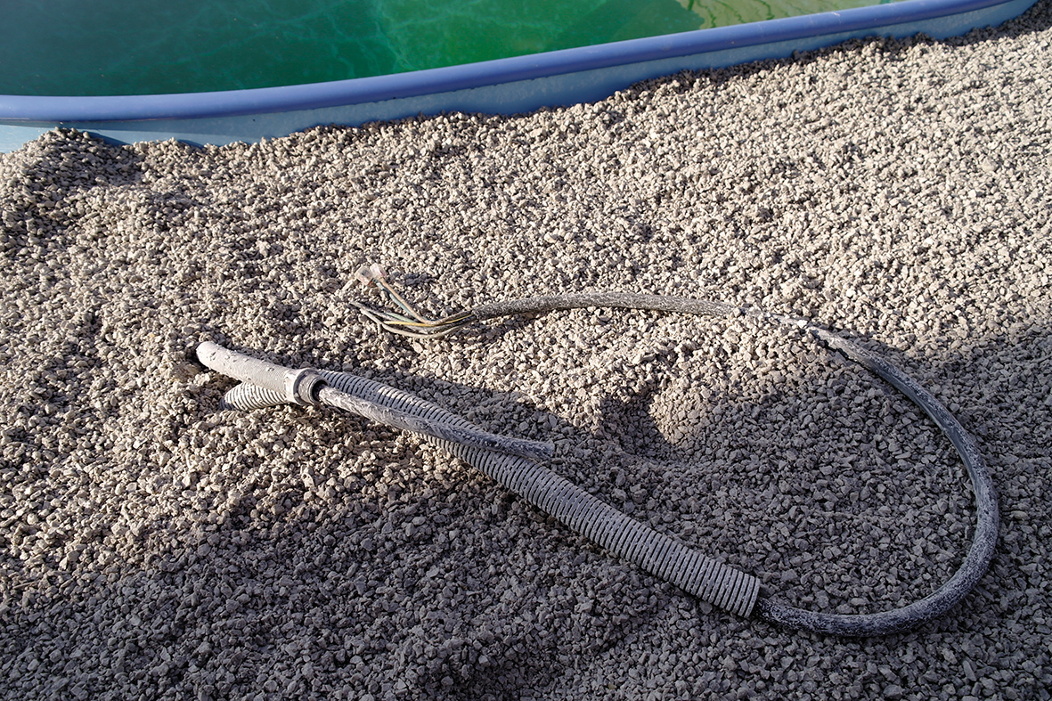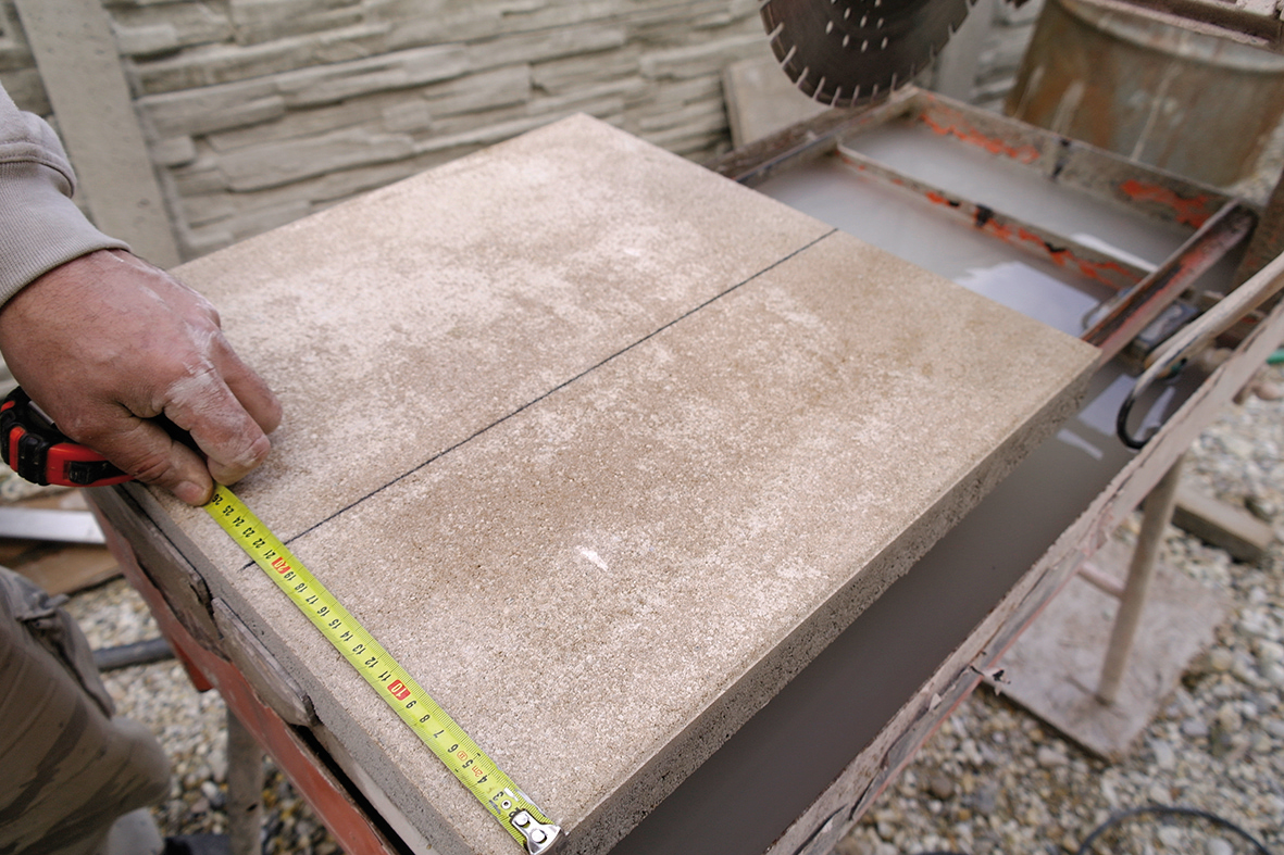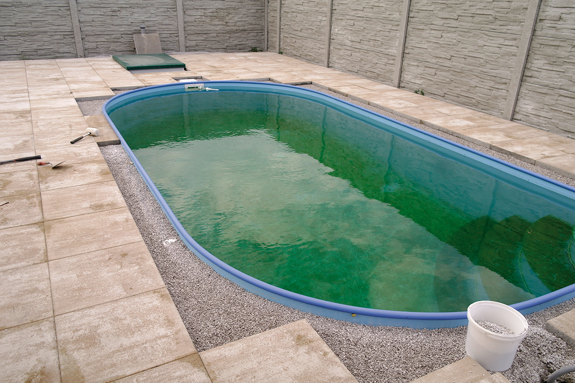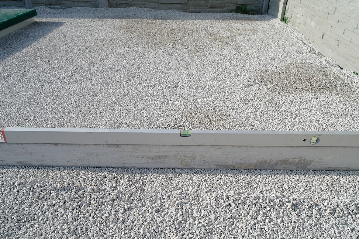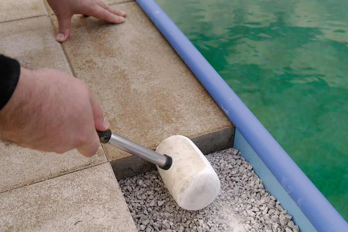 Odrezky záhradných platní sa najskôr zasunú pod okraj bazéna a položia sa na štrkové lôžko. Usadia sa poklepaním gumeným kladivom a vodováhou sa zistí rovinnosť uloženia.