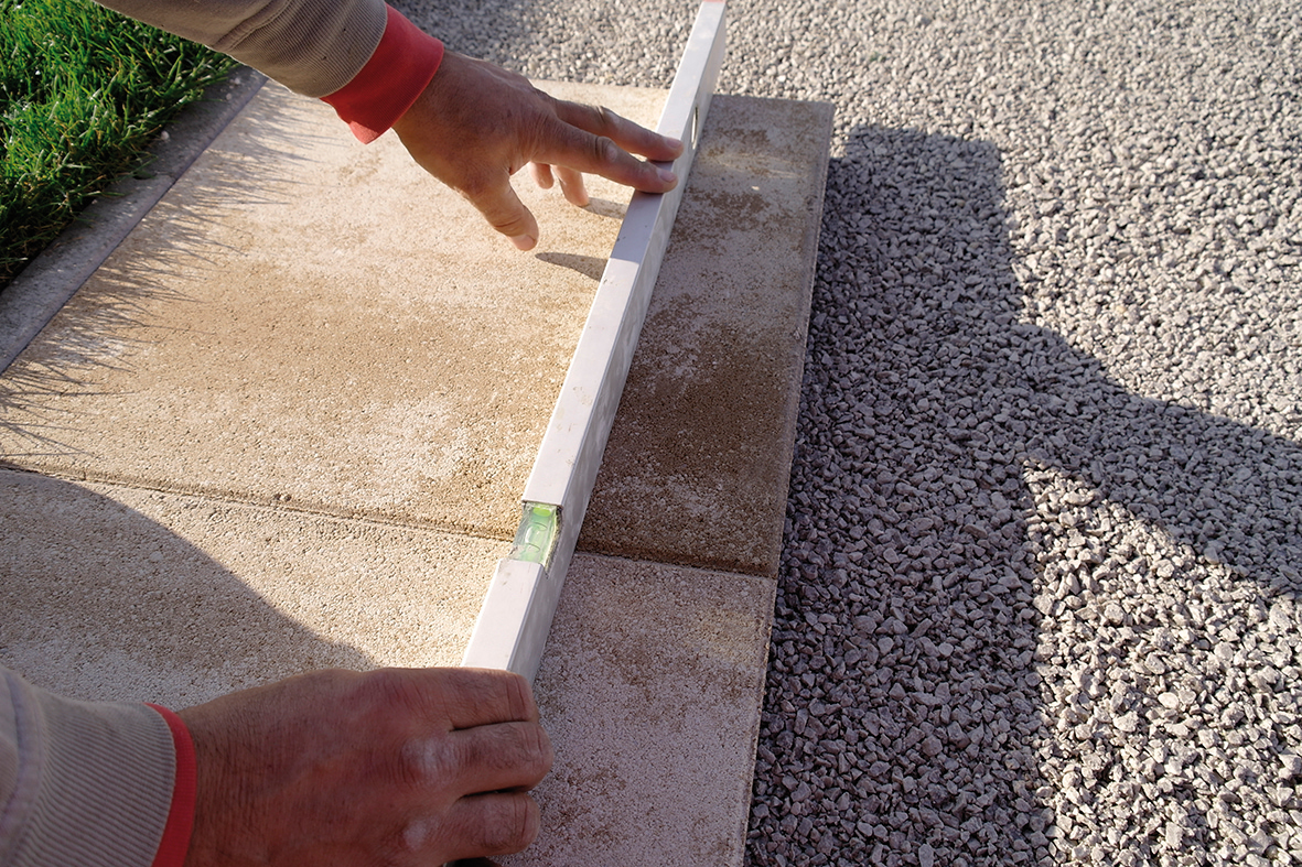 Takto sa postupne kladú jednotlivé záhradné platne vedľa seba, pričom sa pomocou dvojmetrovej vodováhy priebežne kontroluje rovnnosť uloženej dlažby. Vodováha sa kladie cez tri až štyri uložené záhradné platne.