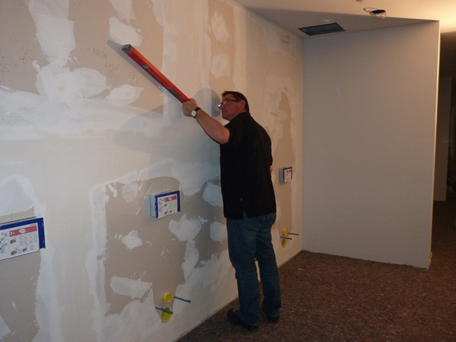 Pri pracovnom postupe hralo kľúčovú úlohu vyrovnanie podkladu, pre dosky 3 x 1 m bolo potrebné dosiahnuť rovinnosť na 100%. Potom bola podkladová plocha ošetrená penetráciou (Ceresit CT 19) – tá redukuje savosť podkladu, zlepšuje jeho pevnosť a následnú prídržnosť lepidla. Súčasne viaže prípadný prach, vzniknutý brúsením spojovacích škár v sadrokartóne. Po vymeranie celej plochy a rozmerových úpravách jednotlivých dielov sa mohli veľkoformátové obklady Forezzi lepiť.