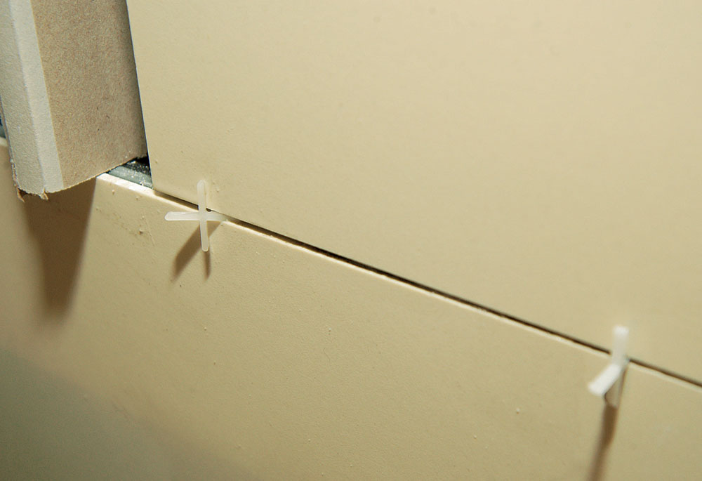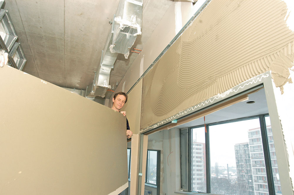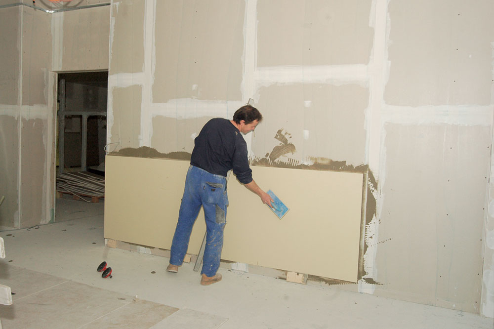 Kľúčom na lepenie veľkoformátových dlažieb je rovný a dobre pripravený podklad. Z tohto dôvodu sa na suché sadrokartónové priečky naniesol hĺbkový penetračný náter na báze neutrálnej disperzie zo syntetických živíc s malým množstvom pigmentových prísad. Náter neobsahuje rozpúšťadlá, účinkuje hĺbkovo na hornej hrane danej konštrukcie, zvyšuje jej pevnosť a znižuje nasiakavosť. Jeho výhodou je aj vysoká univerzálnosť, takže sa dal použiť na všetky nasiakavé podklady, teda okrem sadrokartónu aj na betónovú podlahu.