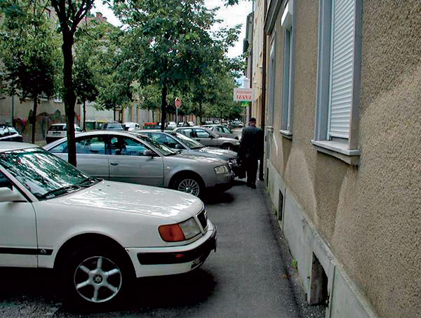 Dopravná situácia v našich sídlach je veľmi nelichotivá, skôr zlá ako dobrá. Najmä agresivita vlastníkov motorových vozidiel je alarmujúca. Malý počet parkovacích miest v pomere k veľkému množstvu vozidiel spôsobuje, že motorové vozidlá zaberajú aj trasy pre chodcov a cyklistov (obr. 3).