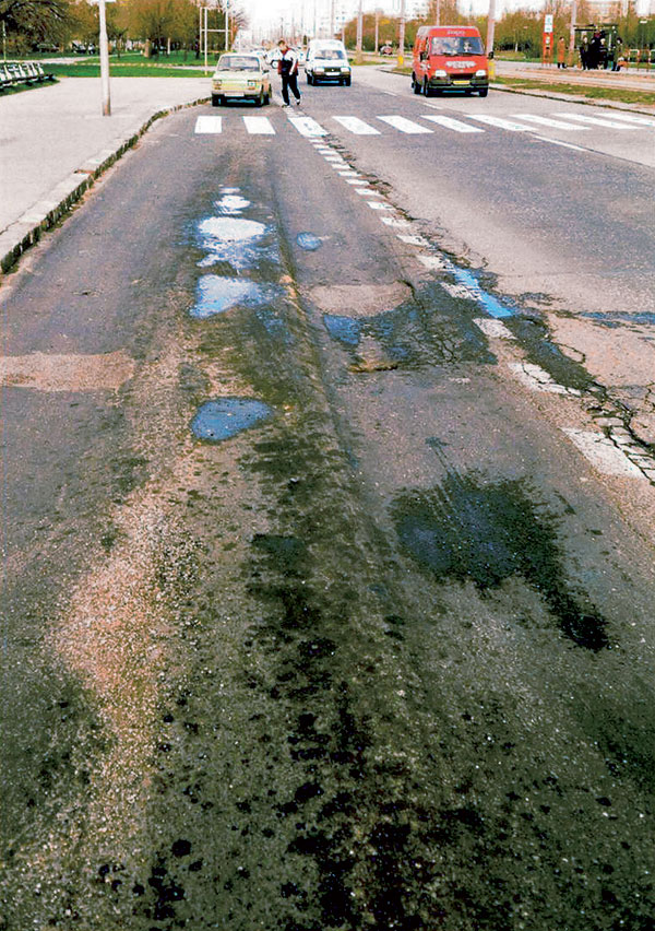 Ďalšia skutočnosť, ktorá môže spôsobiť problémy dopravy v sídlach, je stav konštrukcií vozoviek na miestnych komunikáciách. Pod ich kvalitu sa podpisuje preťaženie dopravou, nedostatočná, v podstate žiadna údržba a v mnohých prípadoch aj nedostatočná kontrola parkovania (pozri obr. 4).