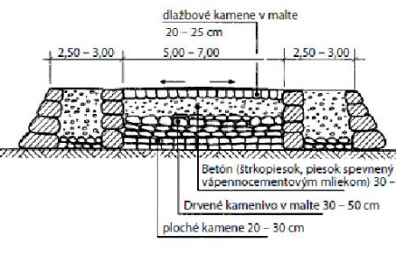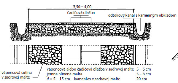 Obrázky 1 a 2 predstavujú konštrukcie vozoviek, ktorých kryt v časti jazdných pásov tvoria bazaltové alebo vápencové kamenné platne uložené do sadrovej malty. V časti krajnice sú vápencové kamenné prvky uložené do zmesi zo sadrovej malty. Odvodňovacie zariadenie tvorí kamenná dlažba.