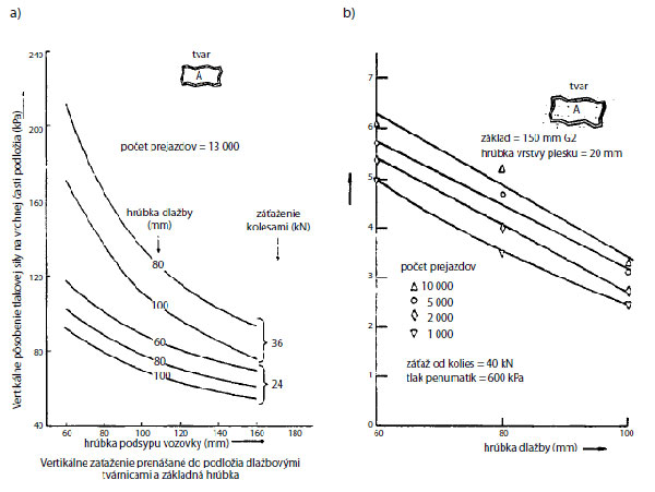 Na zjednodušený spôsob návrhu možno použiť aj návrhové grafy pre jednotlivé tvary dlažbových prvkov, ktoré boli vyhotovené v zahraničí (obr. 7a, b).