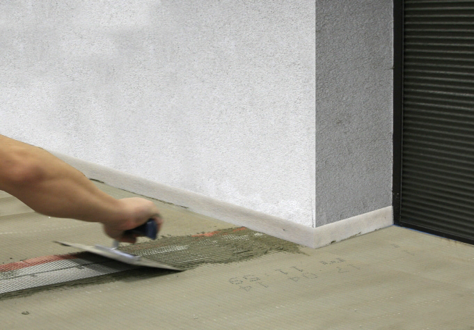 Čerstvá zmes sa nanesie zubovým hladidlom (6 mm). Prvá vrstva hydroizolačnej stierky sa nanesie celoplošne v hrúbke max. 1 mm. Styk prvej vrstvy hydroizolačnej stierky a odkvapového profilu sa prekryje butylkaučukovou samolepiacou páskou, ktorou sa upevní a utesní balkónový profil.