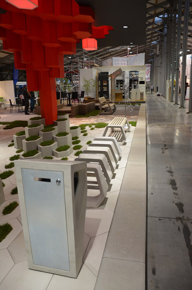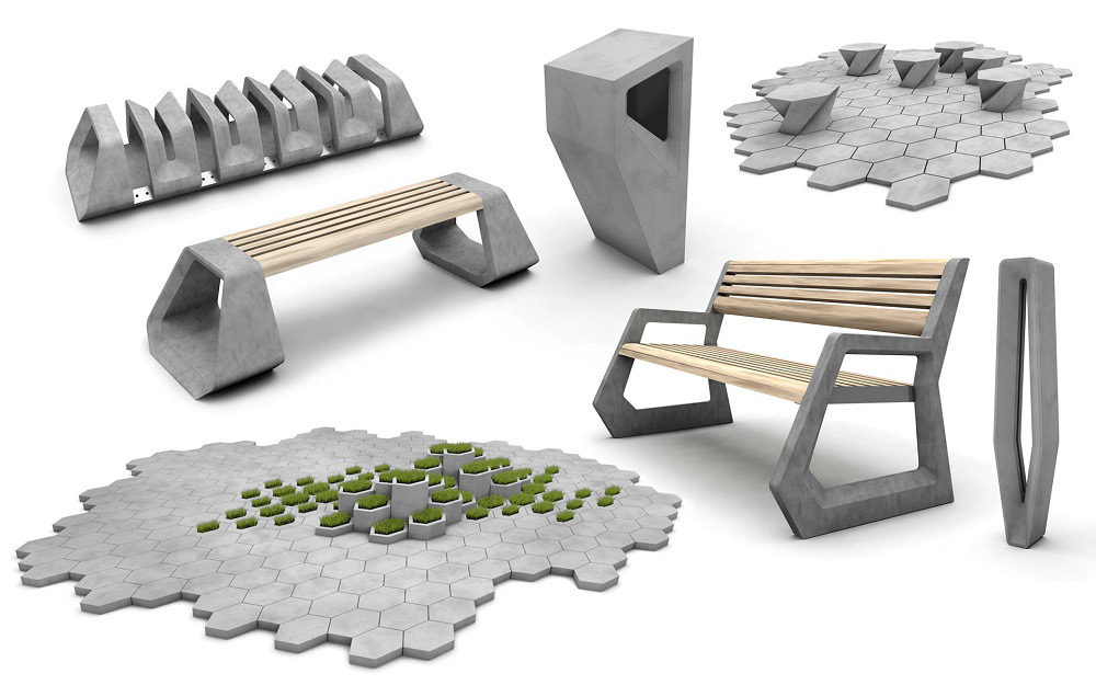 Mestský mobiliár H-E-X je určený do mestského prostredia ulice, pešej zóny či na námestie, súčasne ale i do parku. Dlažba s kvetináčmi môže byť uplatnená mimo mesta v obytnej zóne rodinných domov či v dedinskom prostredí. Prevládajúcim materiálom je hladký pohľadový betón, ktorý zaručuje značnú odolnosť proti poveternostným vplyvom a vandalizmu.