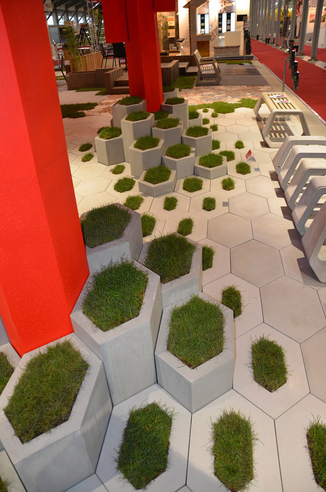 Hexagonálna dlažba spoločne so zatrávňovacími prvkami a kvetináčmi tvorí ucelený systém, ktorý umožňuje značnú variabilitu a skladnosť. Ide o stavebnicu, z ktorej si zákazník môže poskladať zelené ostrovčeky podľa vlastnej predstavy.