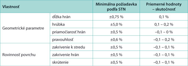 Dôležité sú najmä geometrické parametre ako dĺžka, šírka, hrúbka, priamočiarosť hrán, pravouhlosť, rovinnosť plôch (zakrivenie plochy k stredu – miskovitosť alebo vypuklosť – alebo zakrivenie hrán).