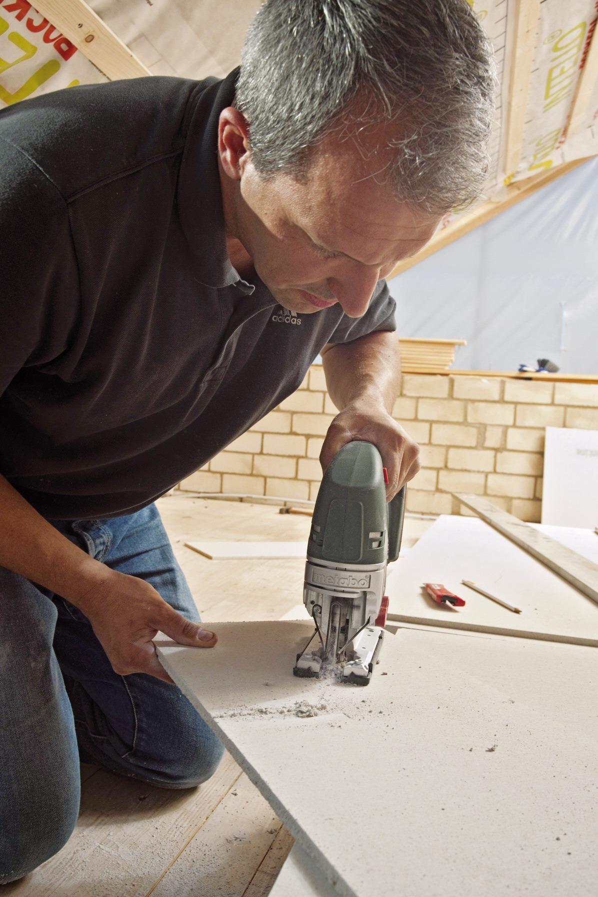 Vo vyhovujúcej pracovnej výške sa odmeria požadovaný rozmer dosky a na vopred označenom mieste sa doska nareže pomocou pravítka a rezača dosky.