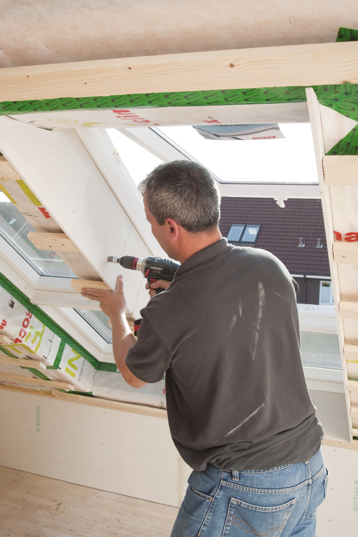Potom sa osadí sadrovláknitá doska na strešnú šikminu tak, aby prekrývala hranu dosky, ktorá tvorí opláštenie otvoru na strešné okno.
