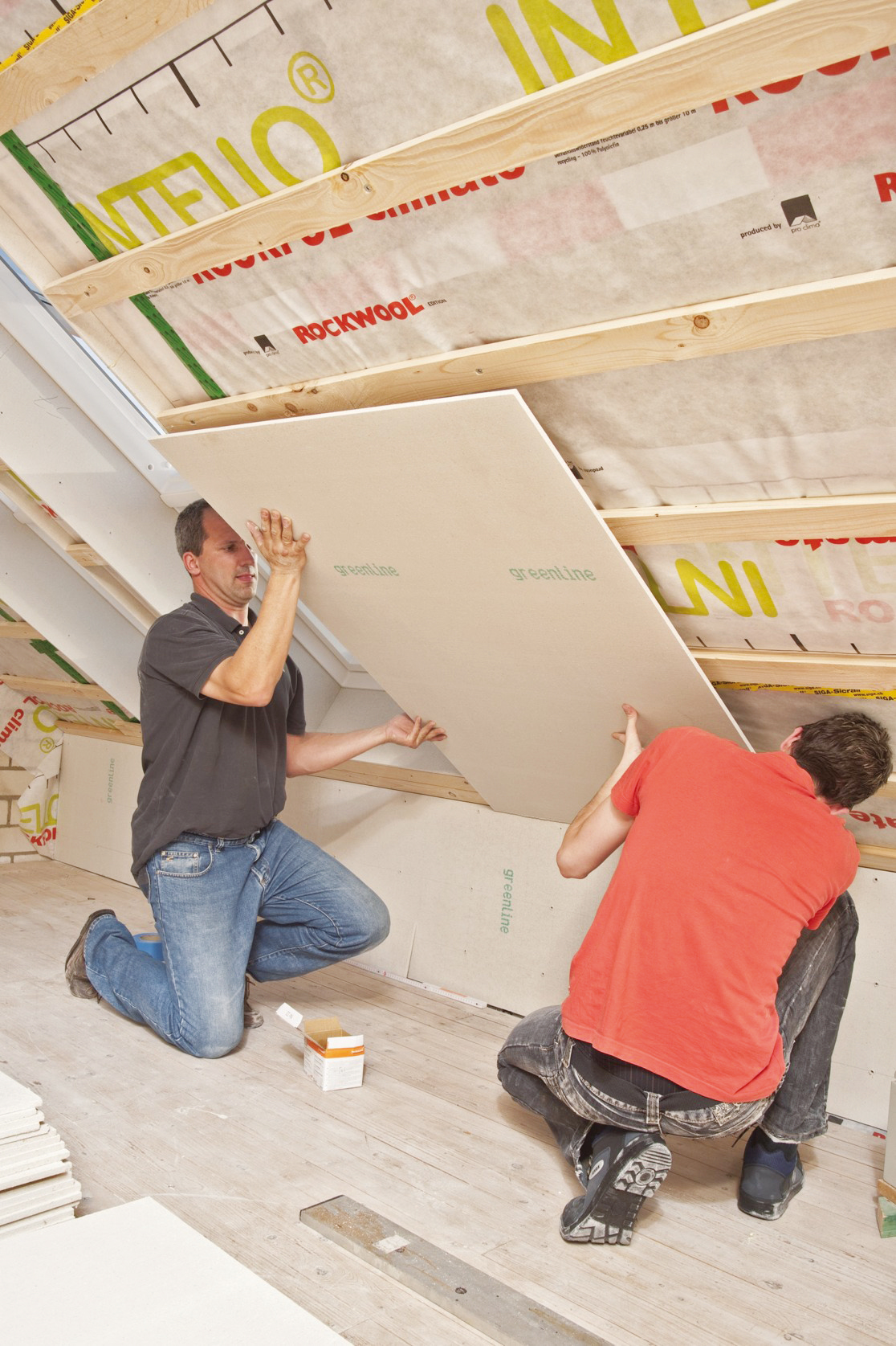 Jednotlivé sadrovláknité dosky sa prenášajú na miesto montáže v polohe nastojato. Sadrovláknité dosky opláštenia strechy sa upevňujú na drevenú alebo na kovovú podkonštrukciu. Aplikujú sa na strešnú šikminu vrátane okolia strešného okna a podkrovnú nadmurovku. Pred zhotovením podkonštrukcie sa medzi krokvy uloží tepelná izolácia podľa projektovej dokumentácie. Na vrstvu tepelnej izolácie sa aplikuje parotesná fólia. Jednotlivé pásy sa ukladajú so vzájomným presahom min. 100 mm podľa pokynov výrobcu. Spoje pásov parotesnej fólie, ako aj miesta napojenia fólie na okolité konštrukcie sa utesnia samolepiacou tesniacou páskou. Následne sa vytvorí drevená zvislá podkonštrukcia v mieste styku podlahy a strešnej konštrukcie.