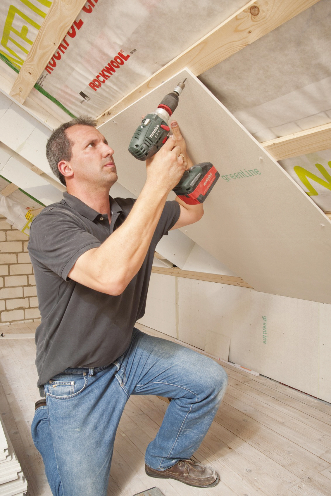 Po uložení tepelnej izolácie a parotesnej fólie sa osadí podkonštrukcia kolmo na podlahu. Montážne laty sa osadzujú v max. osovej vzdialenosti 500 mm. Potom sa montážne laty pripevnia na strešnú šikminu samoreznými skrutkami s max. osovou vzdialenosťou 420 (hr. dosky 10 mm) alebo 500 mm (hr. dosky 12,5 mm).