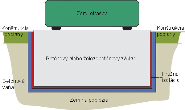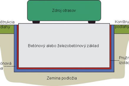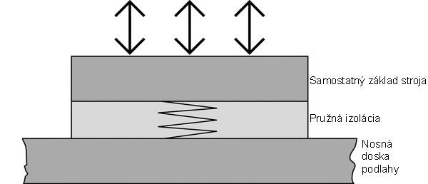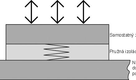 Zvláštne založenie samostatného základu na pružnej izolačnej podložke umiestnenej na doske konštrukcie podlahy je možným riešením v prípadoch s menšou hodnotou kinetickej energie a tiež pri relatívne menších kinetických veličinách (obr. 2).